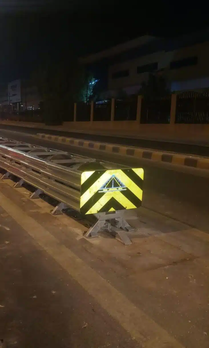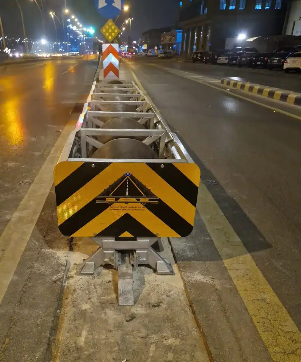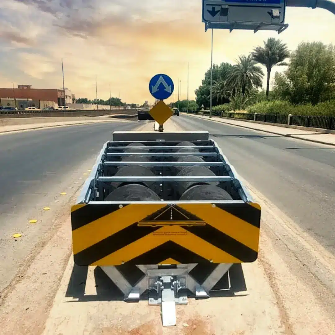 Crash cushion systems designed and developed by Shawahid Industrial Roads Company dissipate collision energy, providing maximum protection for lives and minimal damage to vehicles in the event of an accident.